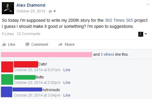 A year ago, I solicited for inspiration leading up to my 200th story in Year One. This was the result from my very helpful Facebook friends: